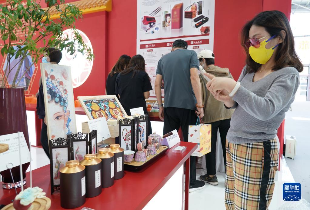 9月5日,在服贸会首钢园区的文旅服务专题展区,观众了解京韵国潮下午茶产品。