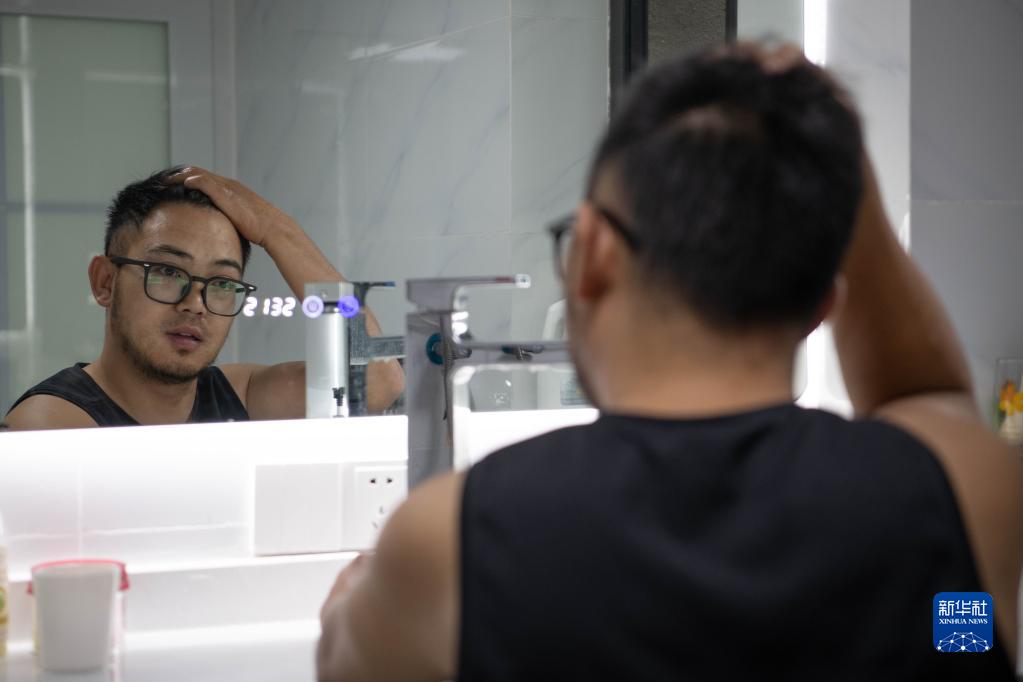8月27日,何鹏在家中整理发型。