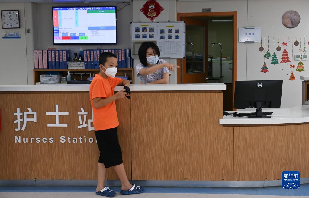8月30日,在北京高博博仁医院,小曲(化名)在玩遥控玩具车,护士长吴小圆与其交谈。