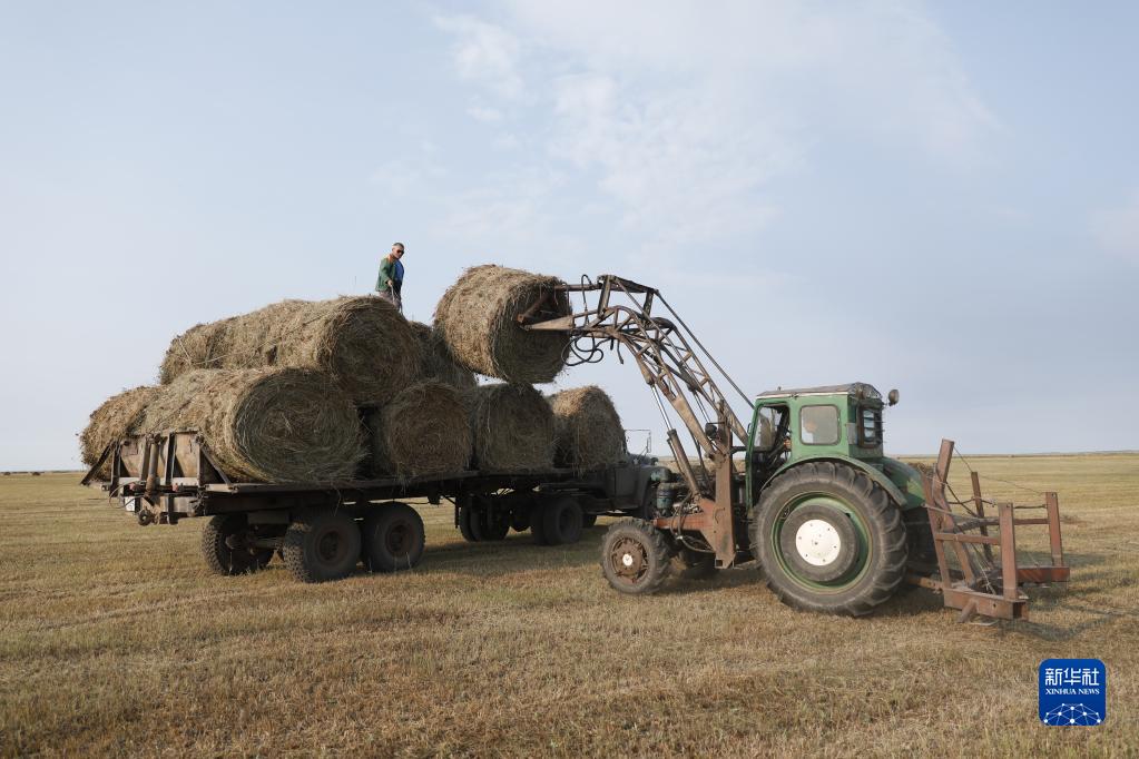 哈萨克斯坦北部地区9月进入牧草集中收割的季节,成片的牧草被牧民收割、晒干并捆成草垛,以备牲畜在冬季食用。新华社发(奥斯帕诺夫摄)