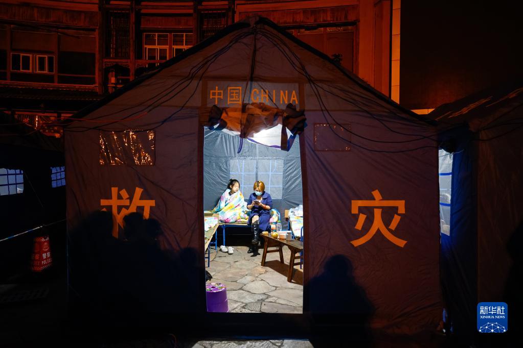 9月5日晚,在四川甘孜州泸定县磨西镇的受灾群众临时安置点,受灾群众在帐篷里休息。