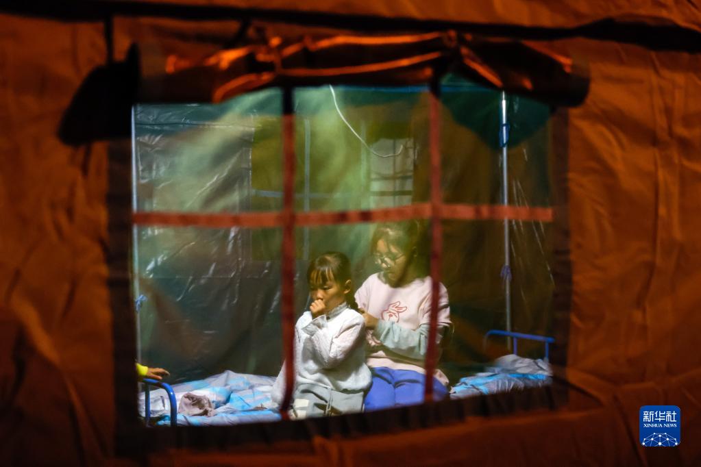 9月5日晚,在四川甘孜州泸定县磨西镇受灾群众临时安置点,两名小女孩在帐篷里。