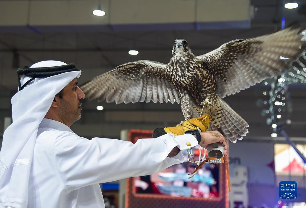 9月5日,一名参展者在卡塔尔多哈的国际狩猎和猎鹰展上展示猎鹰。