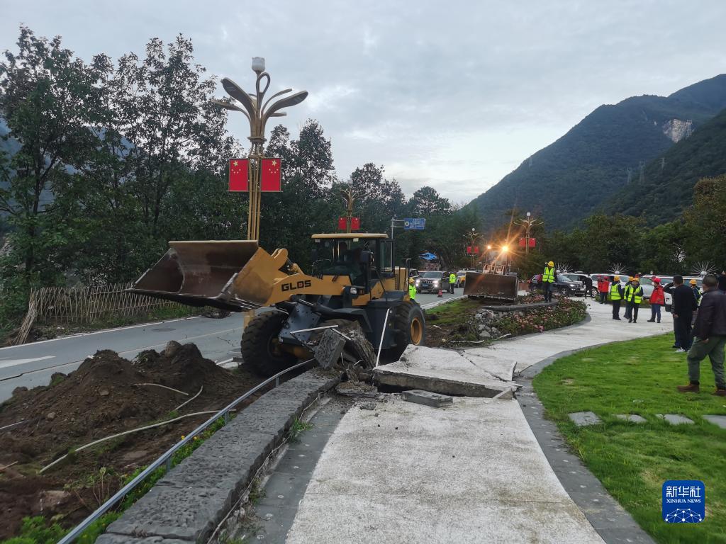9月6日上午,在省道S434线磨西镇至金光村受阻点,工程机械在抢通便道。