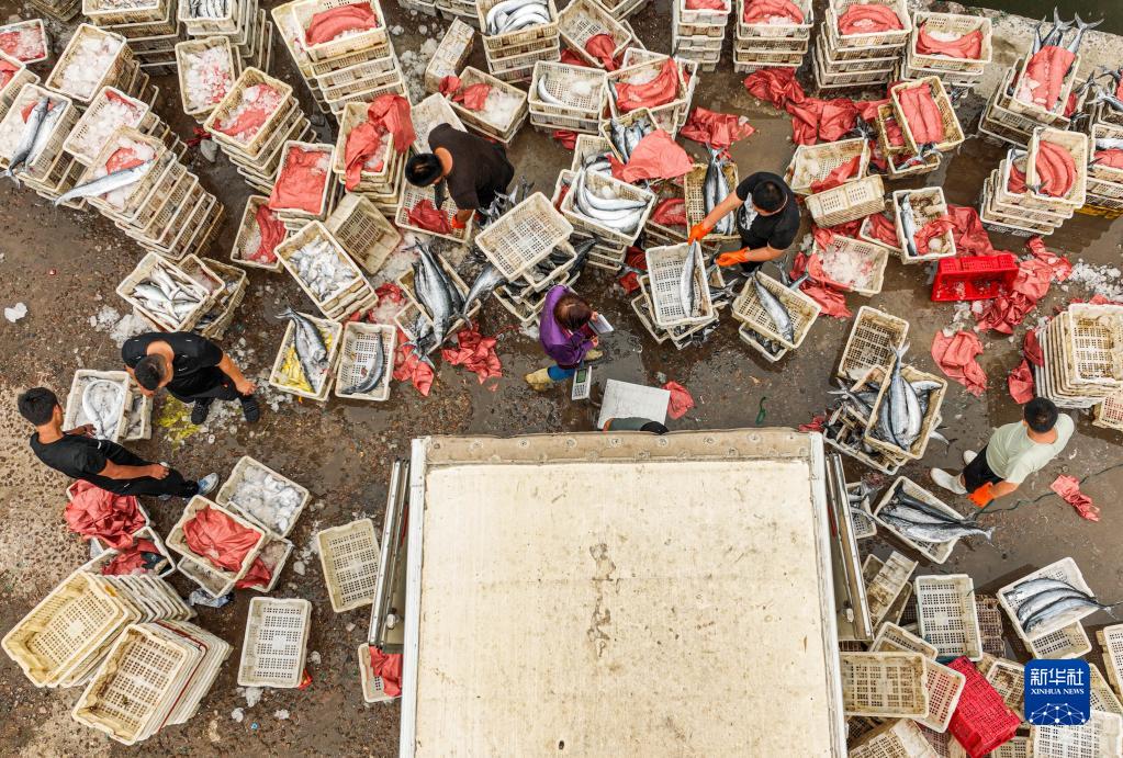 9月5日,在山东省荣成市石岛渔港码头,渔民们分拣、装运各类渔获(无人机照片)。