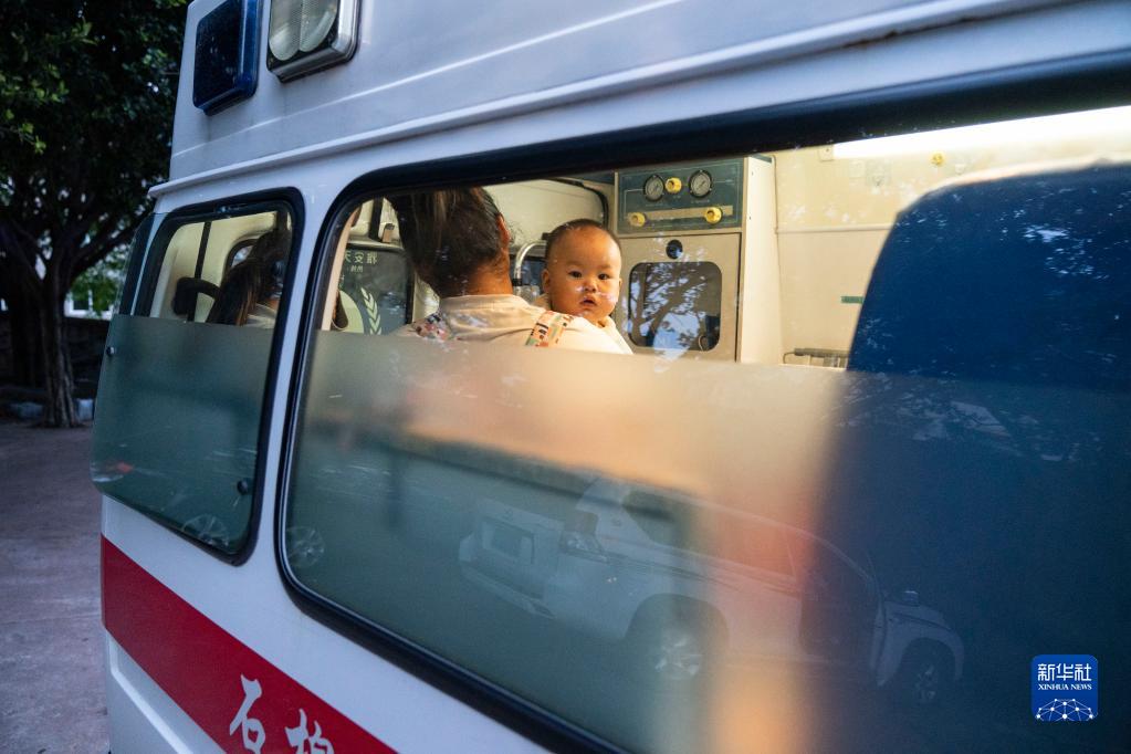 9月6日,在石棉县中学的临时起降点,一名从石棉县幸福村转运来的婴儿望向救护车外面。