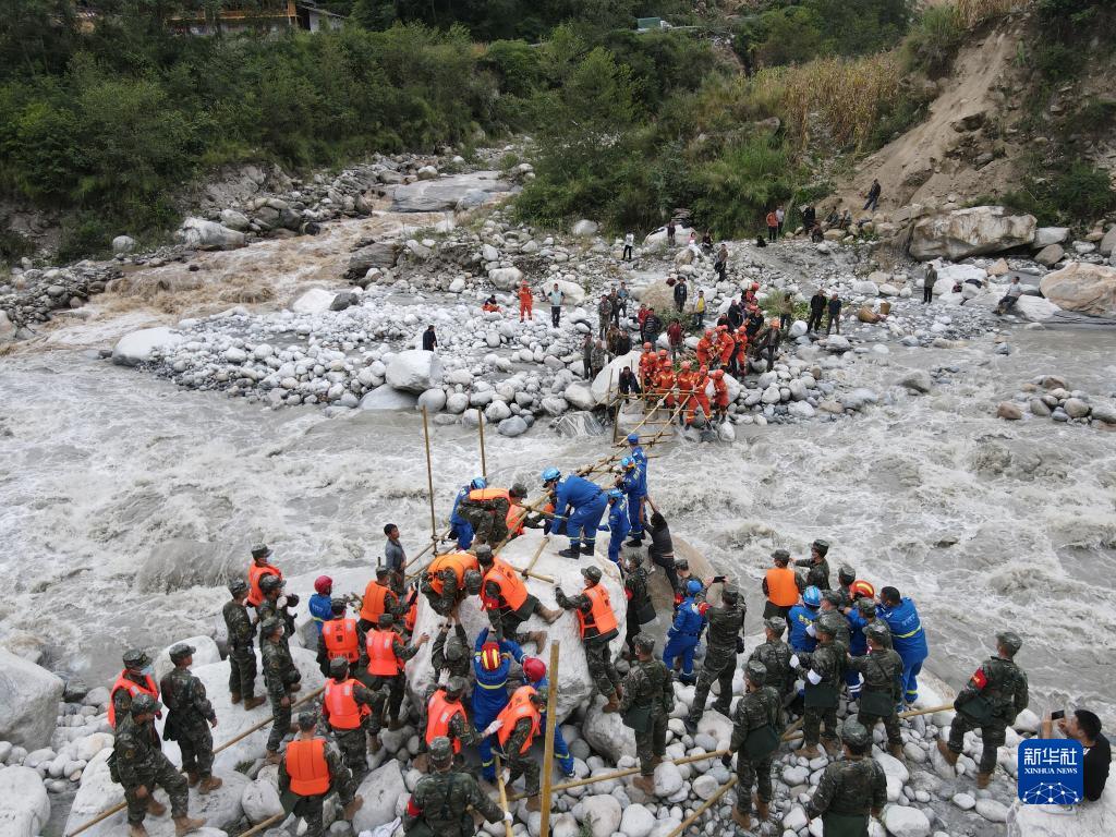 9月6日,武警四川总队甘孜支队救援官兵在泸定县磨西镇燕子沟河谷,与多方救援力量一起搭建通往磨子沟村的桥梁。新华社发(叶小龙 摄)