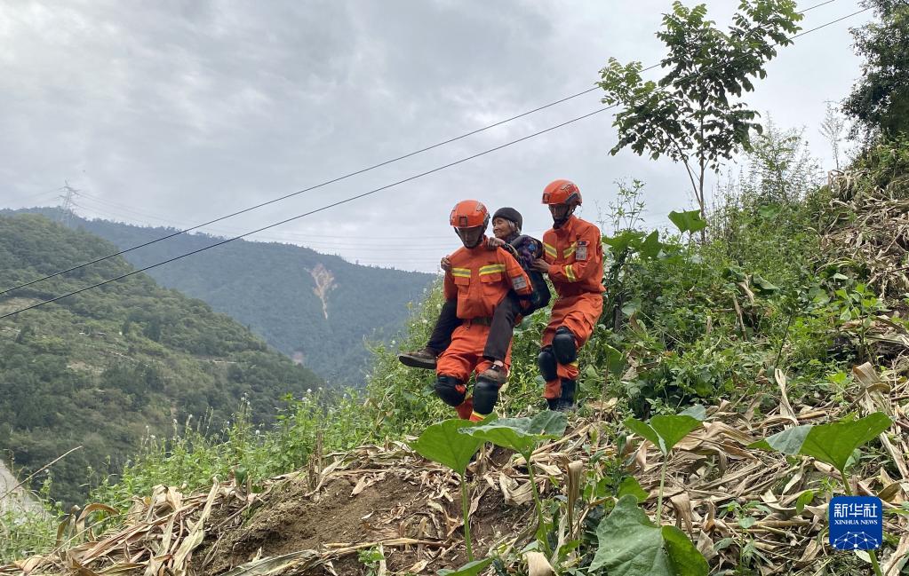 9月6日,四川森林消防总队甘孜支队消防员将一位老人从泸定县得妥镇紫雅场村安全转移出去。