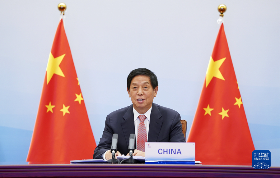 9月6日晚,全国人大常委会委员长栗战书在北京人民大会堂以视频方式主持第八届金砖国家议会论坛并作主旨发言。新华社记者 张领 摄
