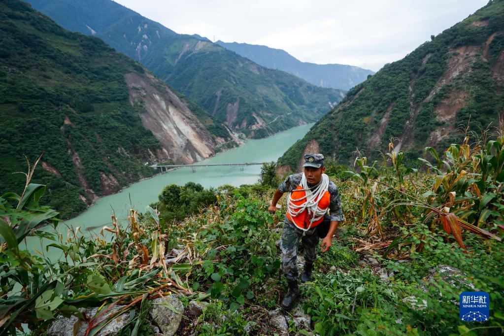 9月6日,救援人员攀爬高山,向泸定县得妥镇湾东村挺进。