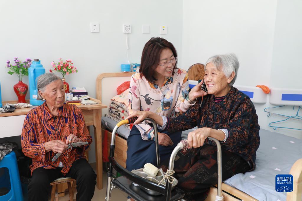 9月6日,在山东省滨州市沾化区康教医养综合服务中心,院长高子美在帮助79岁的老人丁增英(右一)接听电话。