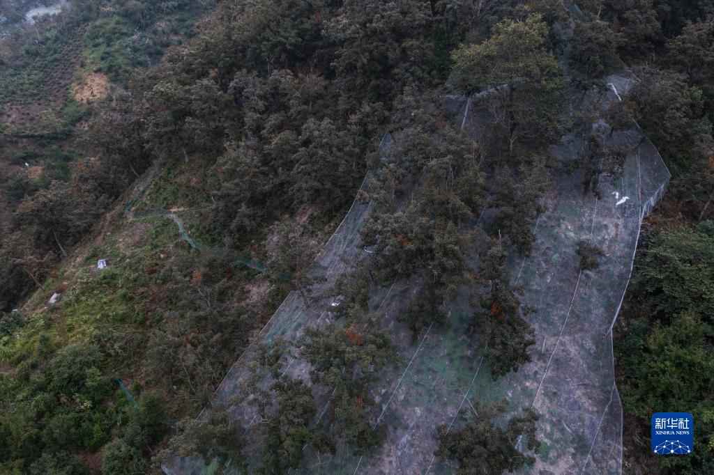9月7日,空中俯瞰群山中的淳安县临岐镇审岭脚村,山林中种植了大批山核桃树,树下铺了大片的采收网(无人机照片)。