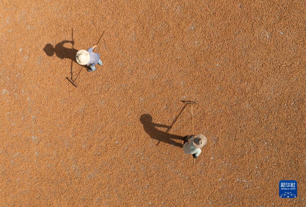 9月7日,在淳安县临岐镇的山核桃“共富工坊”加工企业内,当地村民晾晒刚采收的山核桃(无人机照片)。