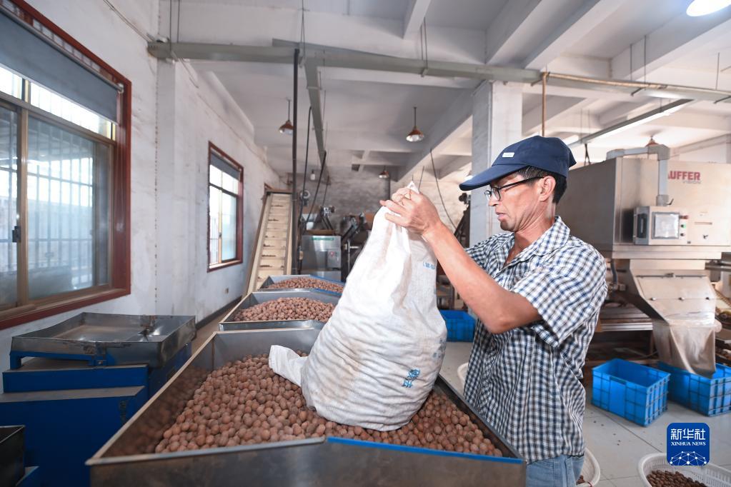 9月7日,在淳安县临岐镇的山核桃“共富工坊”加工企业内,当地村民加工刚采收的山核桃。