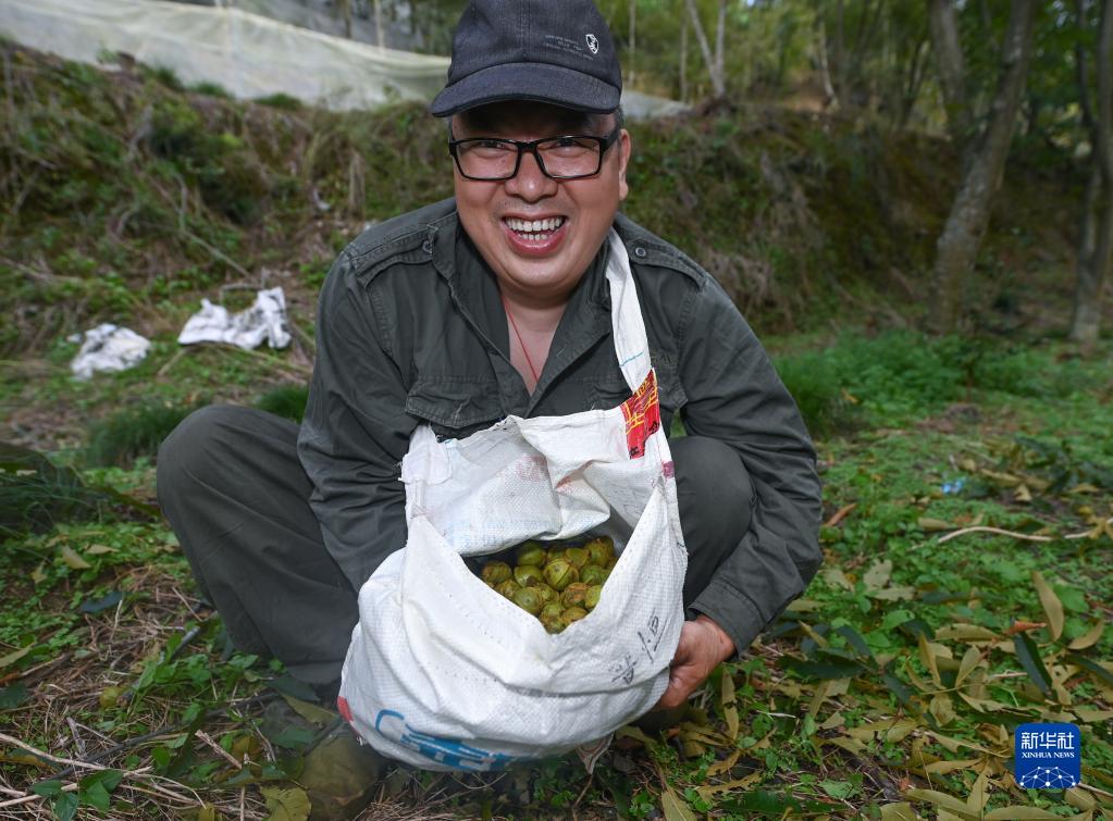 9月7日,在淳安县临岐镇审岭脚村的山核桃林中,农户鲁梦进展示刚刚采收的山核桃果。