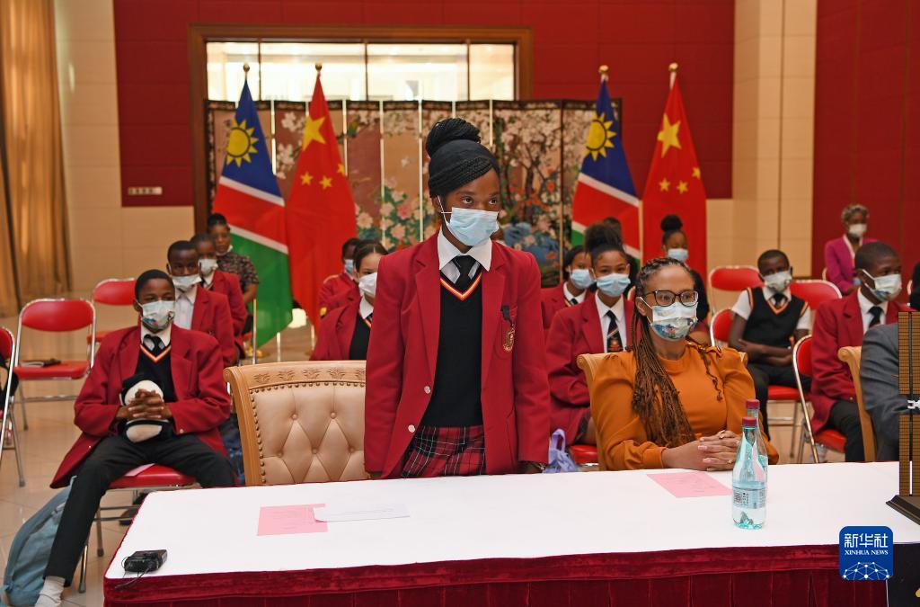 9月6日,在纳米比亚首都温得和克的“天宫对话”活动纳米比亚分会场,一名学生向中国航天员提问。