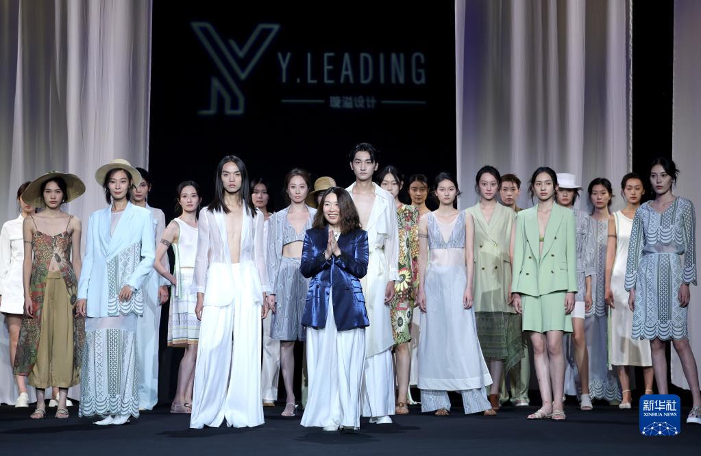9月7日,设计师王凤(前中)和模特在时尚发布上谢幕。