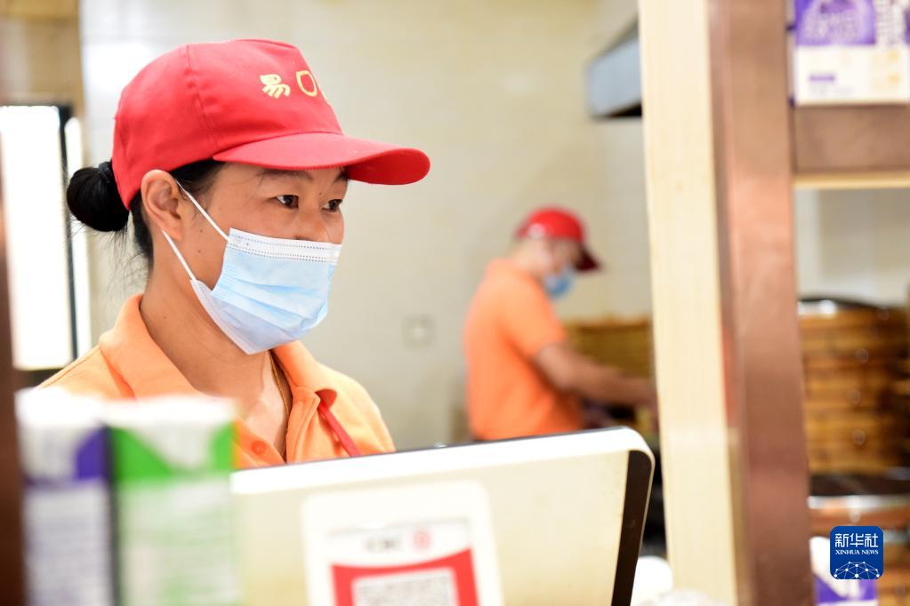9月6日,王素侠(左)在早餐店内为顾客点餐。