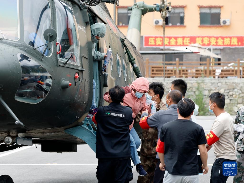 9月7日,首批从海螺沟搭乘直升机疏散出来的滞留人员抵达泸定县磨西镇。新华社记者 沈伯韩 摄