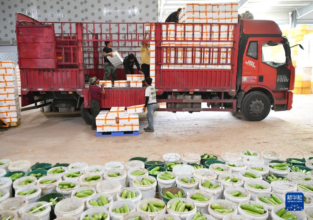 9月5日,工作人员在位于麟游县九成宫镇西坊村的农业示范园将蔬菜装车。