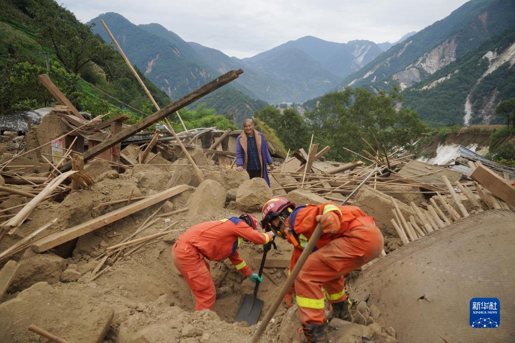 9月7日,四川眉山消防救援队队员在雅安市石棉县王岗坪彝族藏族乡幸福村二组,帮助村民在倒塌的房屋中找寻物品。