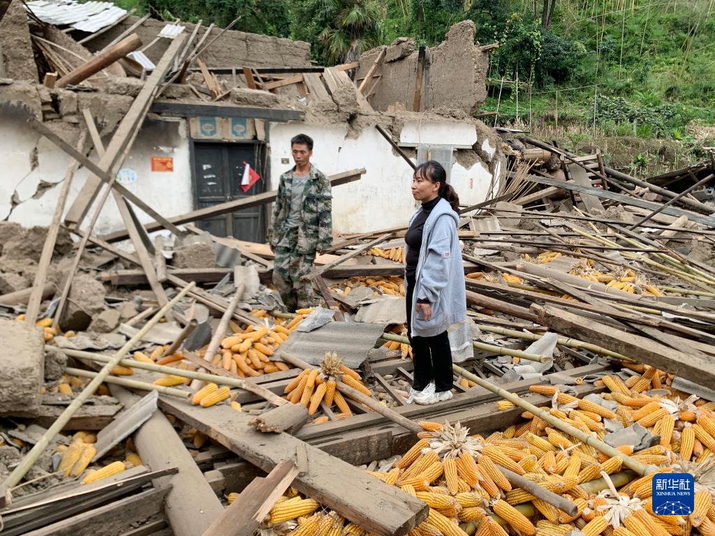 9月7日,在雅安市石棉县王岗坪彝族藏族乡幸福村二组,养蜜蜂为生的康贝兵(左)、陈云夫妇站在倒塌的房屋中。