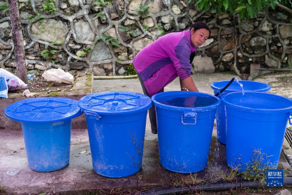 9月7日,在雅安市石棉县王岗坪彝族藏族乡幸福村二组,一名村民在接山泉水,这股山泉水是村民们从山上引下来的。