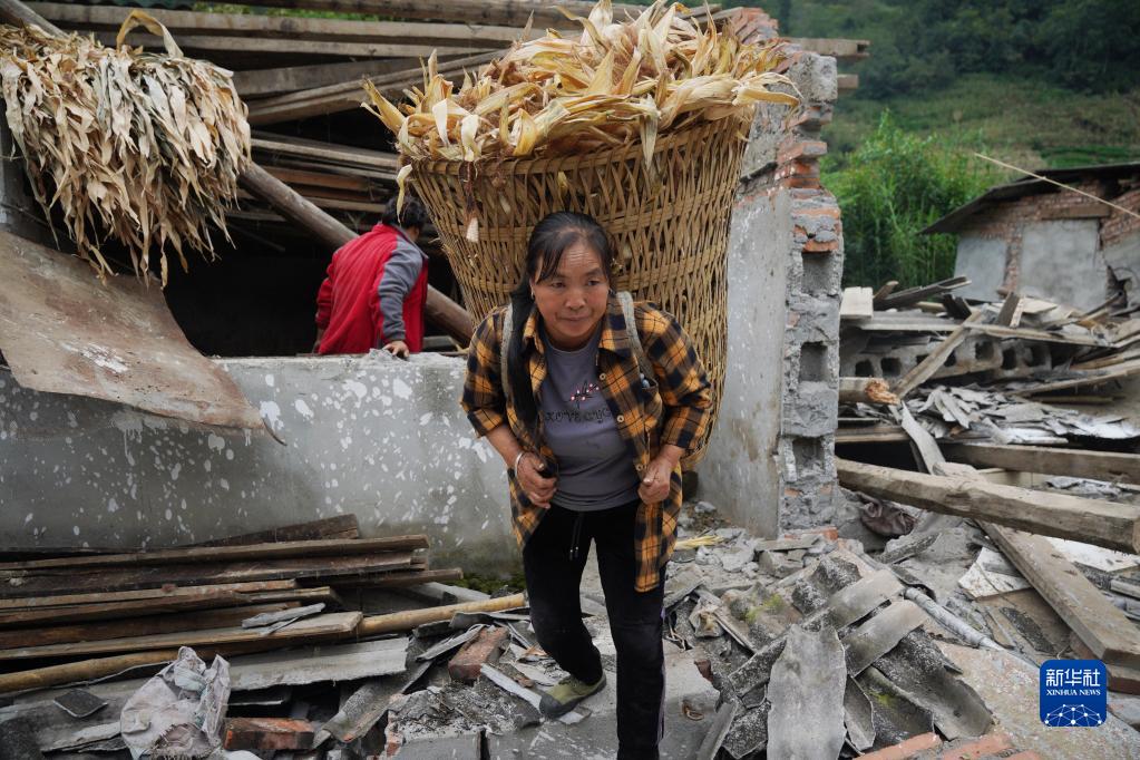 9月7日,在雅安市石棉县王岗坪彝族藏族乡幸福村二组,村民在倒塌的猪圈中搬运苞米叶。