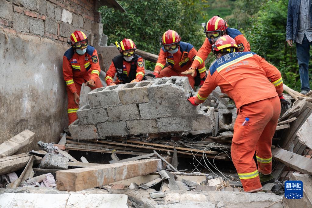 9月7日,在雅安市石棉县王岗坪彝族藏族乡幸福村二组,四川资阳消防救援队员帮助村民清理废墟。