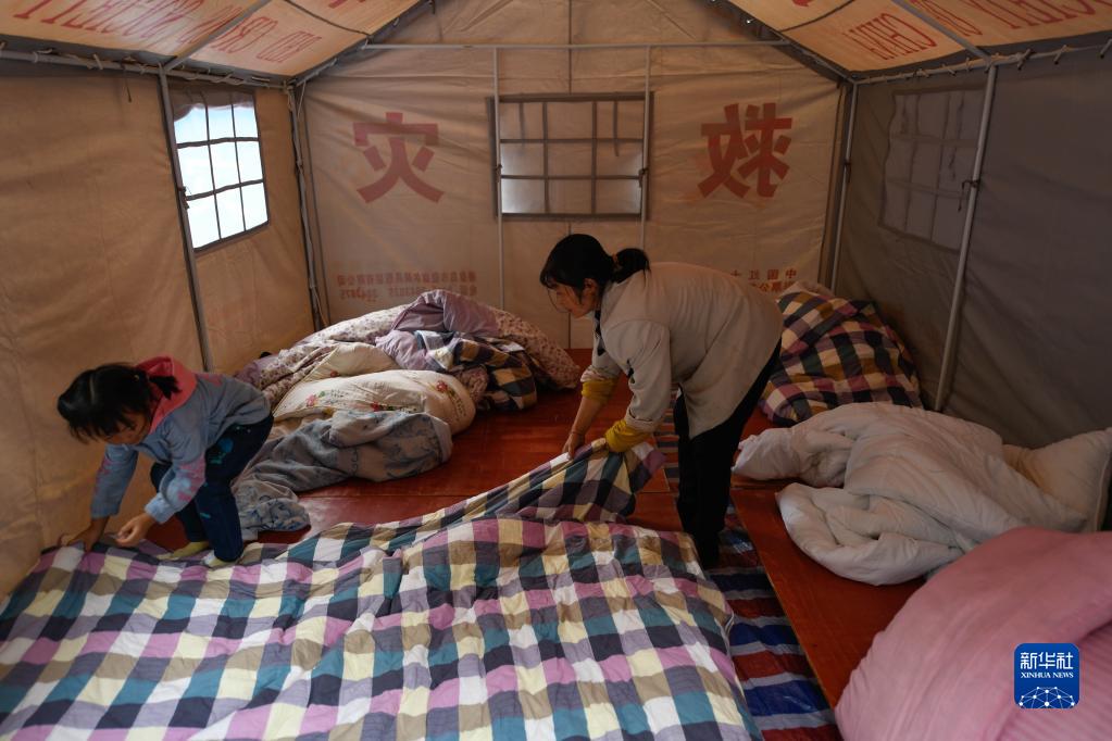 9月7日,石棉县草科乡的群众在帐篷里整理床铺。