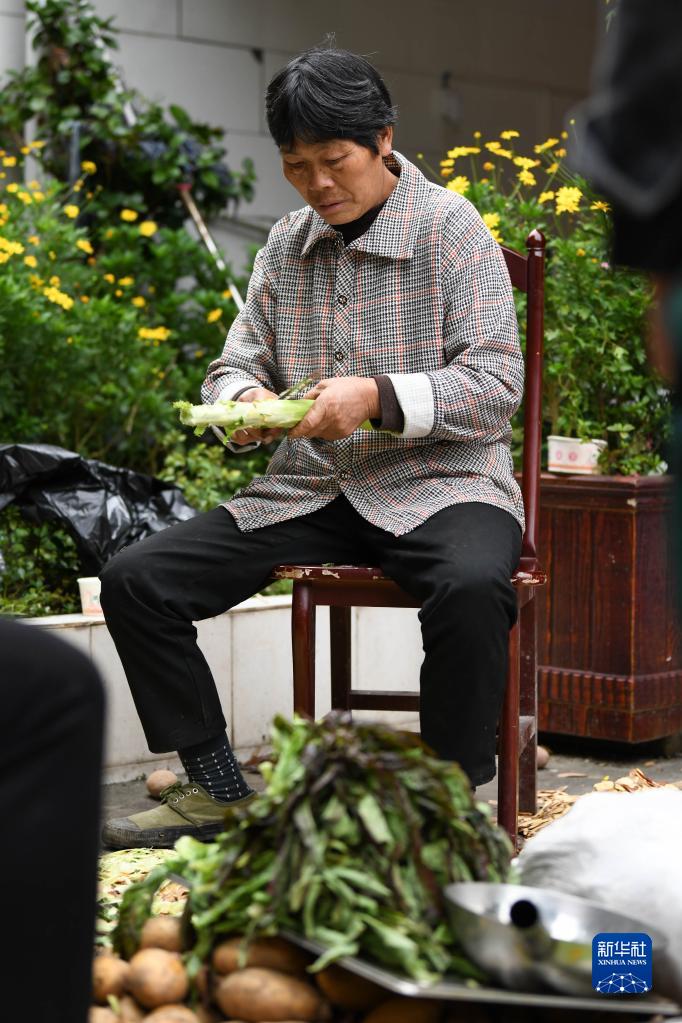 9月7日,在石棉县草科乡政府安置点内,当地群众在准备午饭。地震发生后,该地与外界短暂失联,村民们自发拿出家中食物作为大家共享的生活物资。