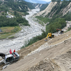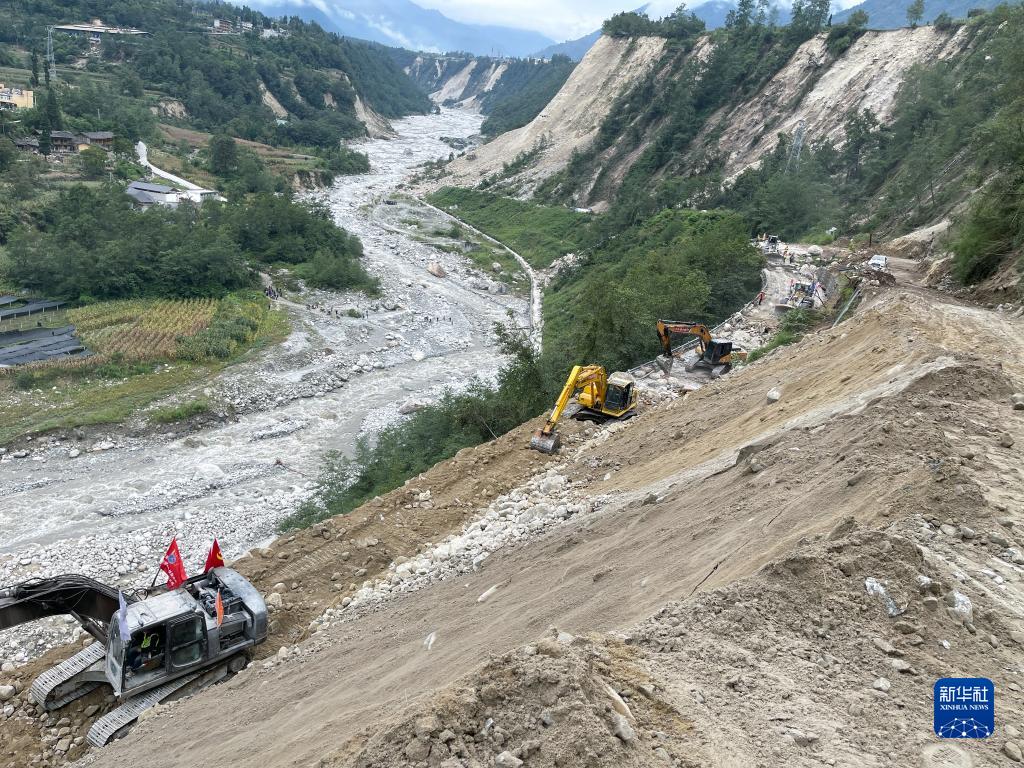 9月7日,在四川省甘孜州泸定县磨西镇附近,四川路桥的工作人员在抢修通往海螺沟景区的道路。