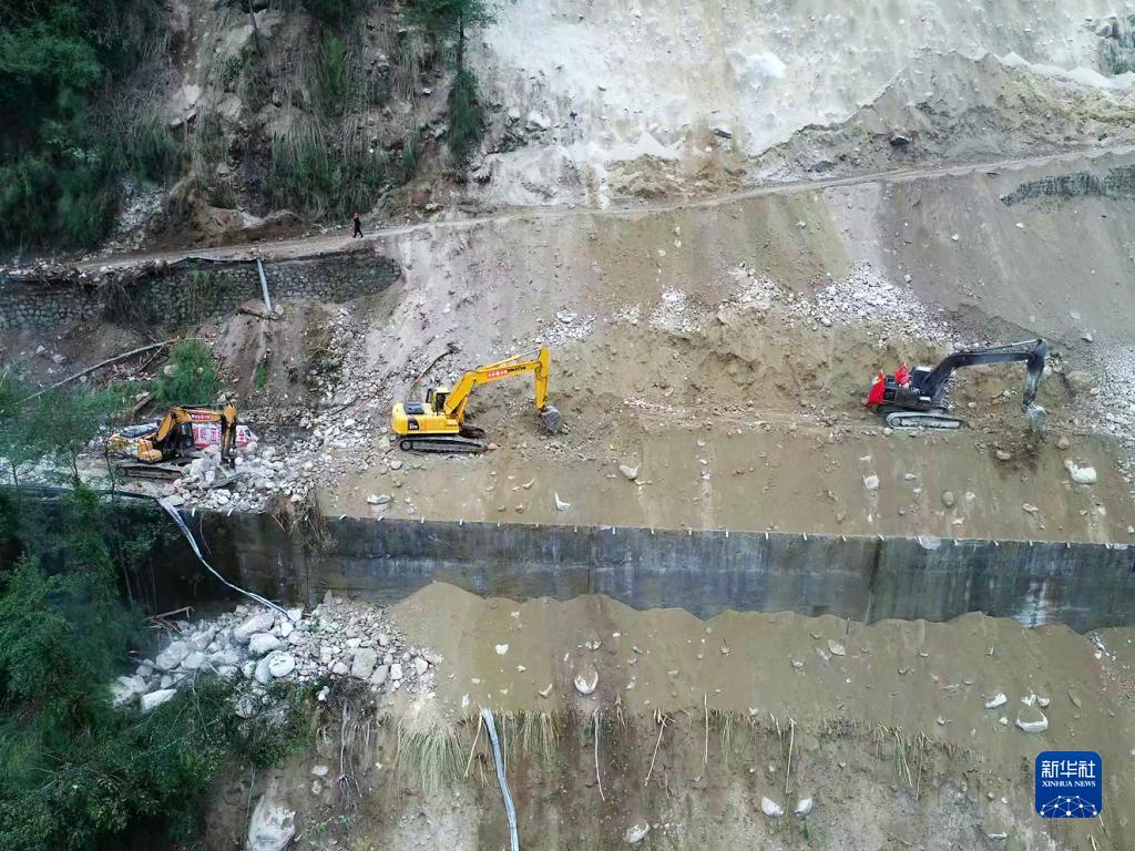 9月7日,在四川省甘孜州泸定县磨西镇附近,四川路桥的工作人员在抢修通往海螺沟景区的道路。