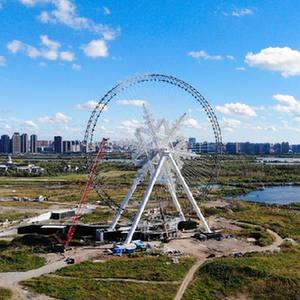 近日,哈尔滨冰雪大世界摩天轮的雪花造型部件完成安装。作为哈尔滨冰雪大世界四季冰雪项目的重要景观工程,摩天轮高120米,辐条和转轮外圈上将安装可控LED点光源彩灯,配置48个空调轿厢,每个轿厢可容纳10人乘坐。当摩天轮升到最高处时,游客可观看到哈尔滨冰雪大世界园区,以及松花江哈尔滨段南北两岸的风光。