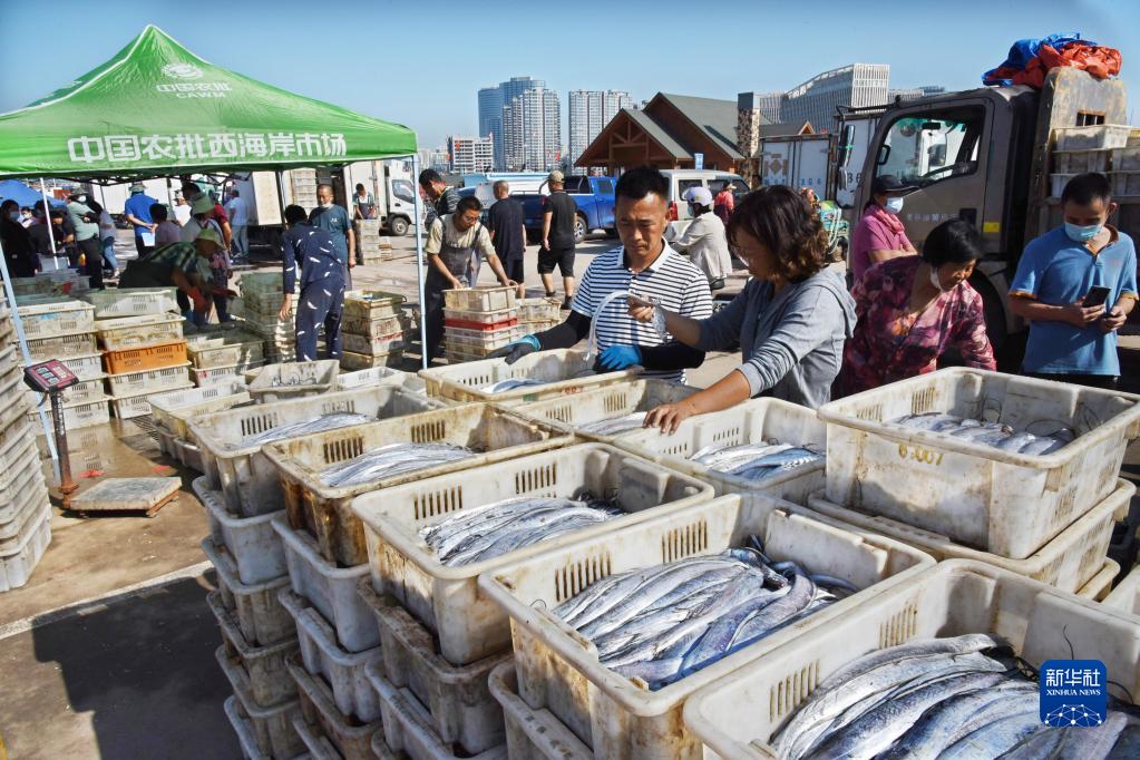 9月7日,在青岛西海岸新区积米崖渔港码头,鱼贩在进货选购。 新华社记者 李紫恒 摄