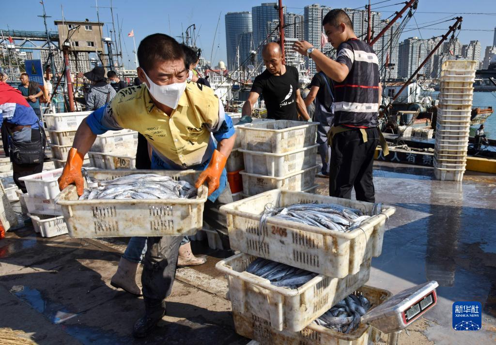 9月7日,在青岛西海岸新区积米崖渔港码头,鱼贩在码头进货过称。 新华社记者 李紫恒 摄