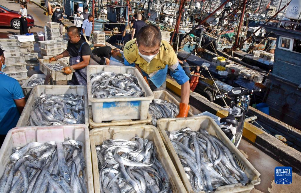 9月7日,在青岛西海岸新区积米崖渔港码头,一位前来进货的鱼贩正在装车。 新华社记者 李紫恒 摄
