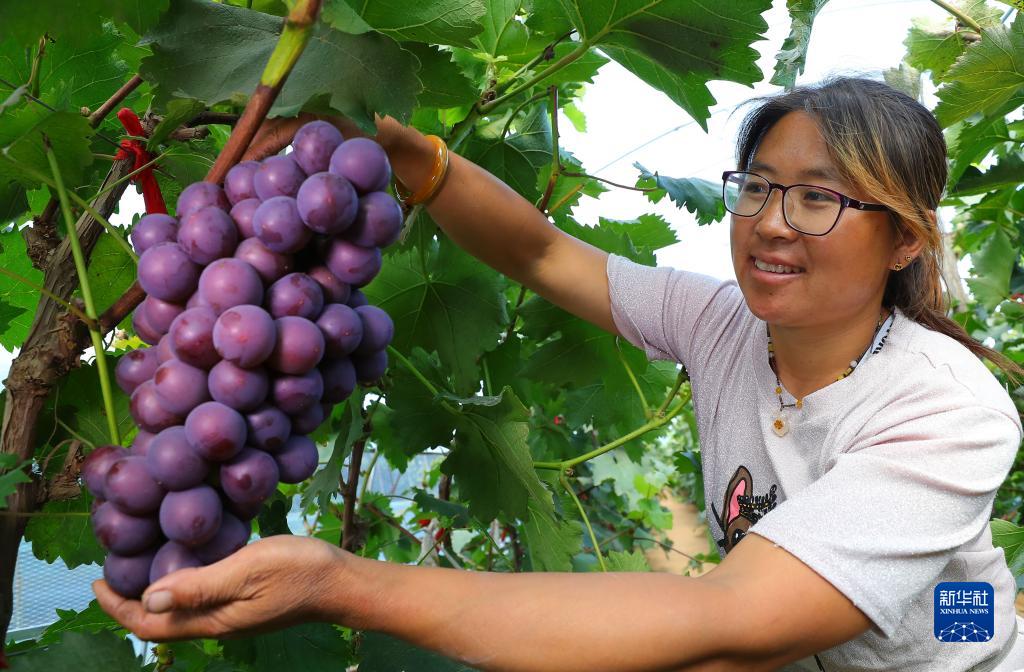 9月6日,在丁家房镇大蛇山子村,果农在大棚里查看葡萄成熟情况。