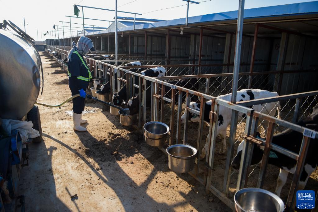 9月7日,在位于托克托县的内蒙古恒富牧业第三牧场,工人在给牛犊投喂饲料。
