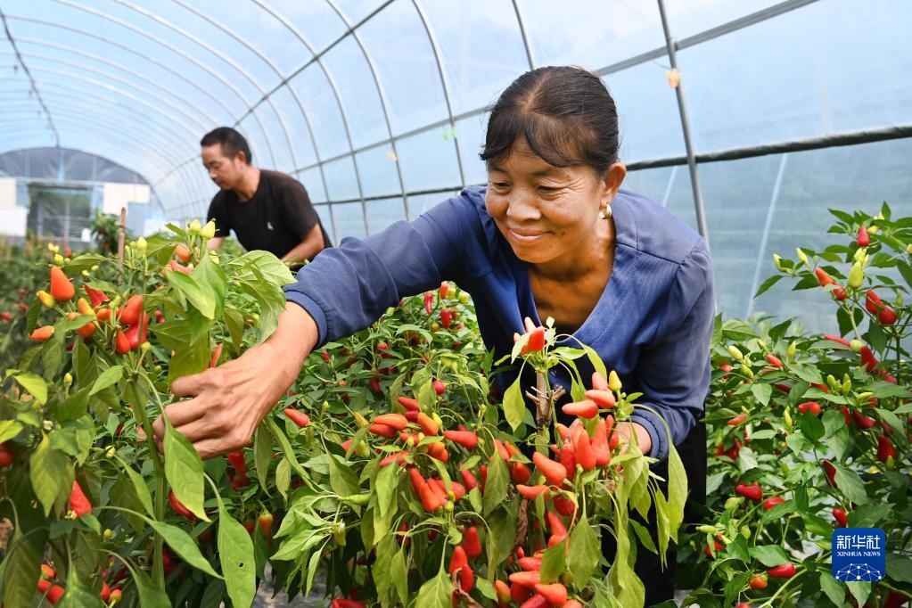 9月7日,陕西汉江之源农业开发有限公司员工在采摘大棚辣椒。