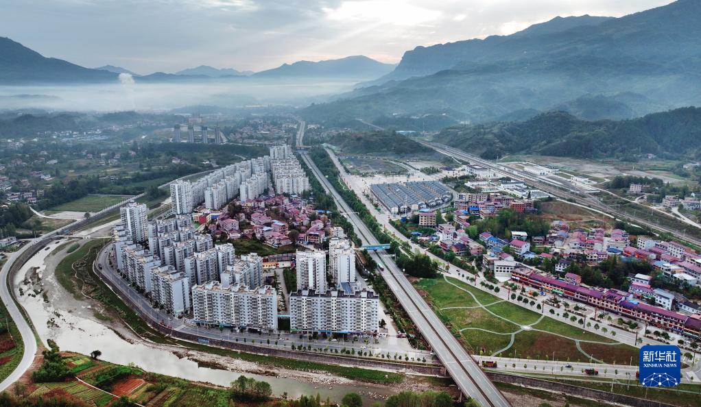 宁强县陕南移民搬迁筒车河安置点(中间道路左侧,9月6日摄,无人机照片)。这里安置了全县范围内因地质灾害、洪涝灾害、扶贫、生态和工程五种类型的移民搬迁户,入住近2万人。