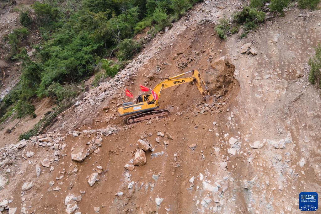 9月8日,四川路桥的工作人员抢修石棉县与泸定县得妥镇之间的道路(无人机照片)。