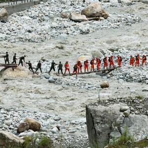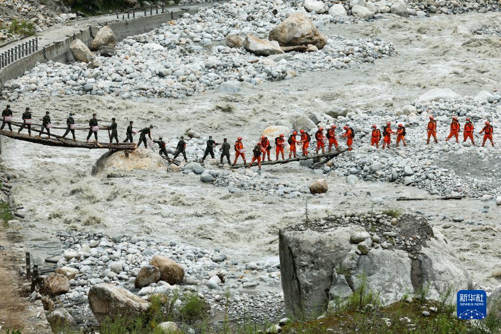 9月8日,在四川省甘孜州泸定县磨西镇附近,救援人员站在临时架设的小桥上向河对岸的村民运送生活物资。