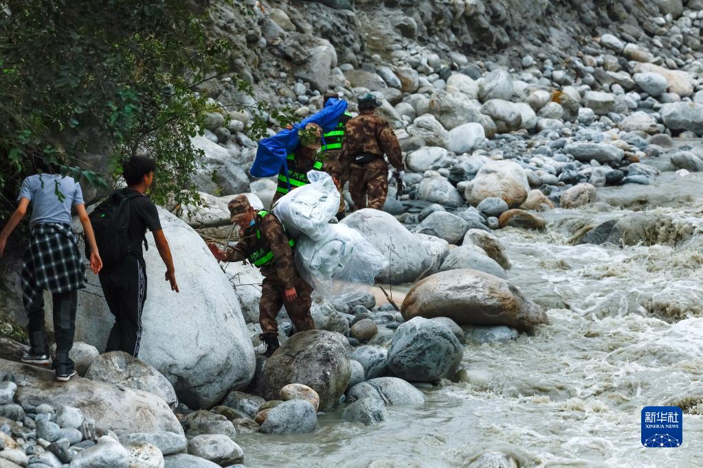 9月8日,在四川省甘孜州泸定县磨西镇附近,救援人员沿着磨西河畔的上山小路运送救灾帐篷等物资。