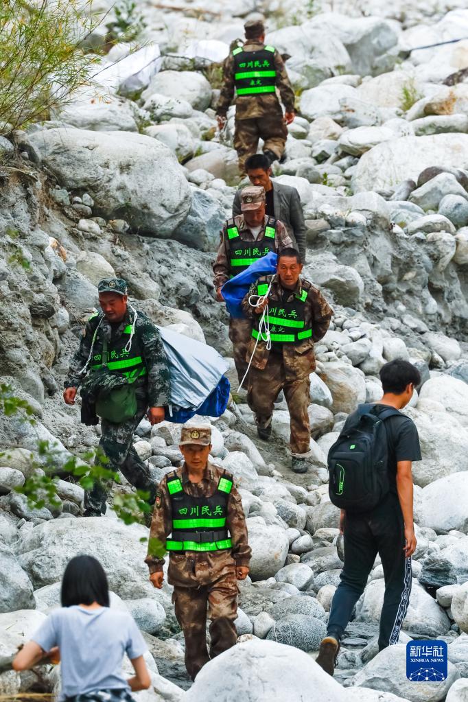 9月8日,在四川省甘孜州泸定县磨西镇附近,救援人员沿着磨西河畔的小路运送救灾帐篷等物资。