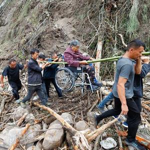 9月8日,在四川省甘孜州泸定县磨西镇附近,人们将一位从磨子沟村疏散出来的受伤人员抬出。
