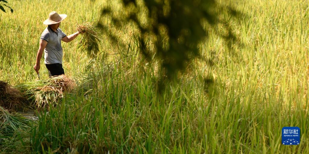 在中国农民丰收节即将到来之际,“世界灌溉工程遗产”“全球重要农业文化遗产”湖南省娄底市新化县水车镇紫鹊界梯田种植的水稻陆续进入成熟期,田野一片金黄,农民利用晴好天气抢收抢割。