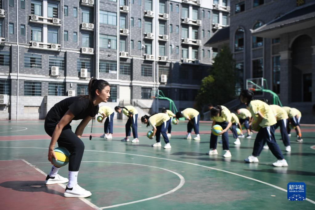 9月6日,于红俊(前)在长沙市明德华兴中学给学生上体育课。
