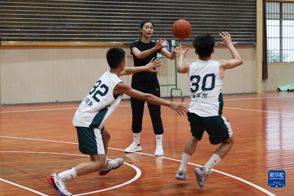 9月6日,于红俊(中)在长沙市明德华兴中学指导篮球队队员训练。