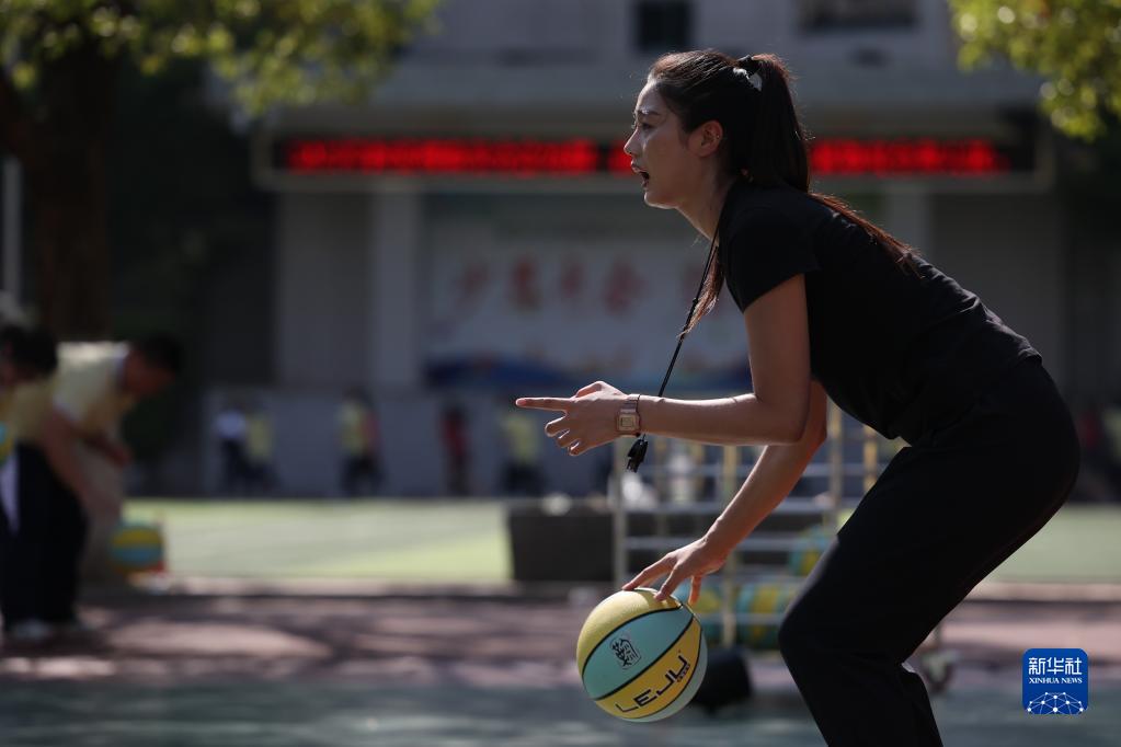 9月6日,于红俊在长沙市明德华兴中学给学生上体育课。